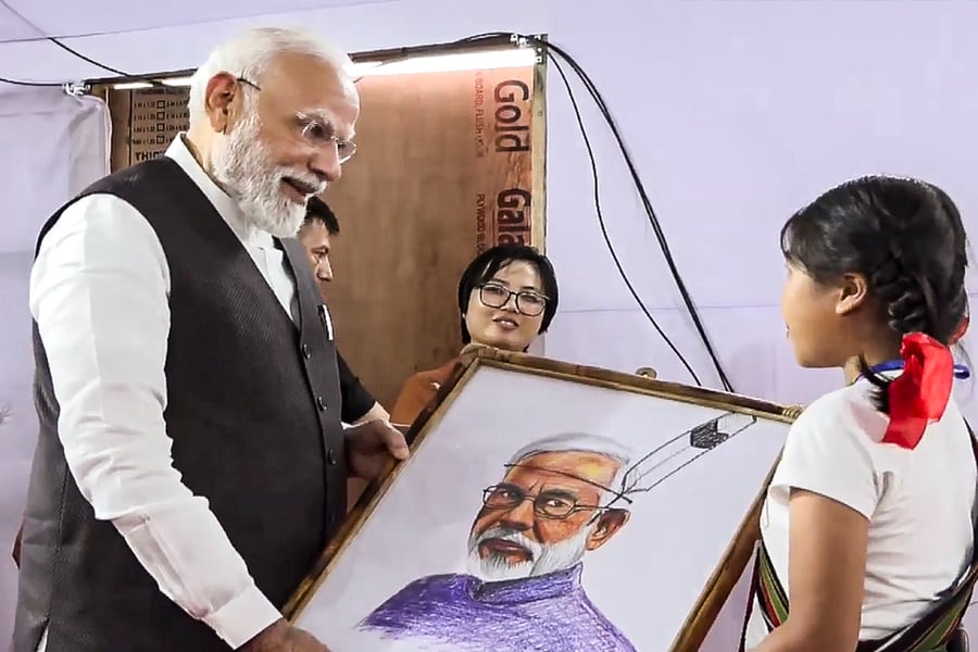 ১৩ সেপ্টেম্বর, শনিবার। চূড়াচাঁদপুরের ত্রাণ শিবিরে গৃহহারাদের সঙ্গে দেখা করলেন মোদি। সেই সময় এক শিশু হাতে আঁকা ছবি উপহার দিলেন প্রধানমন্ত্রীকে। ছবি: পিটিআই।