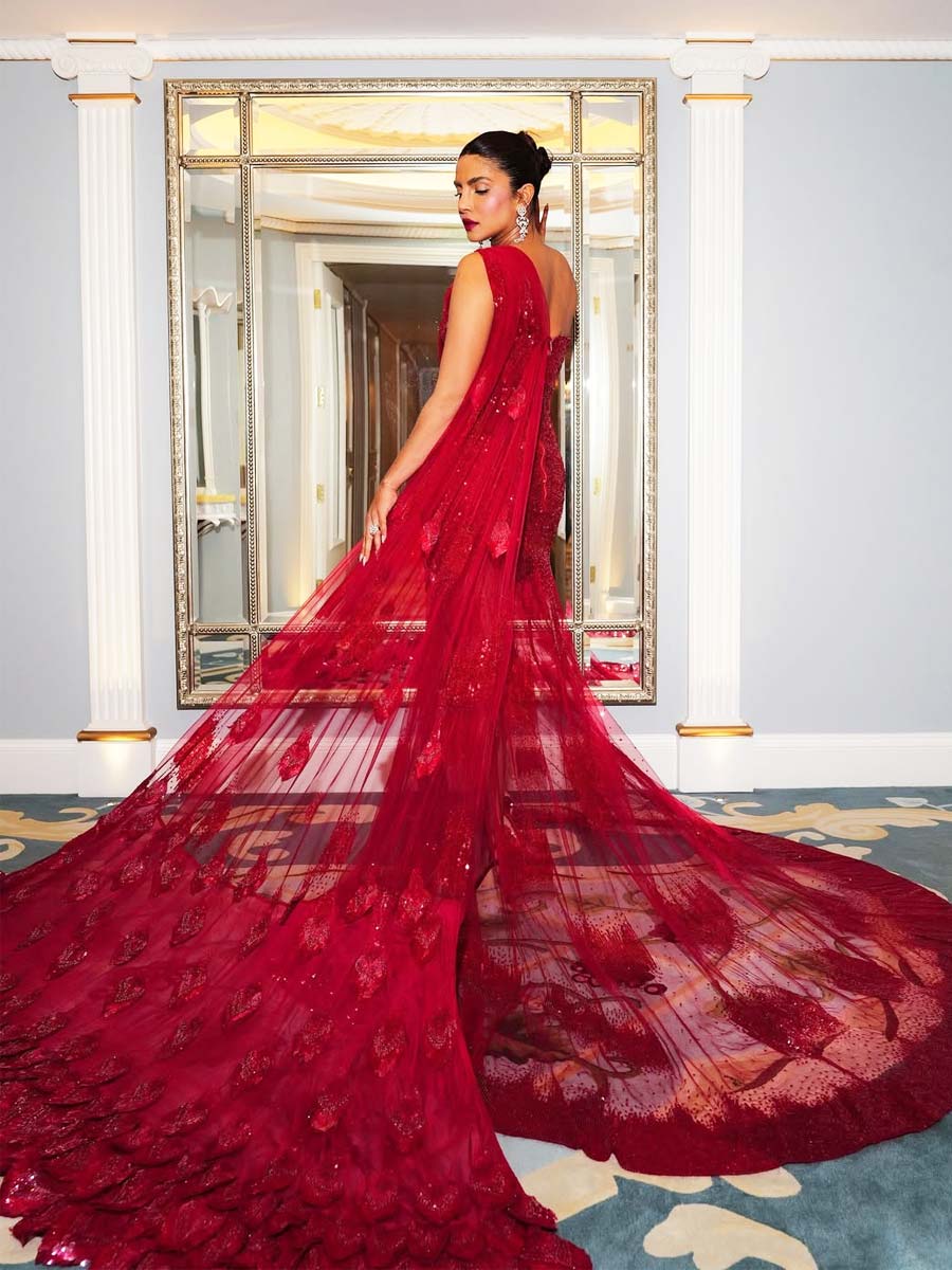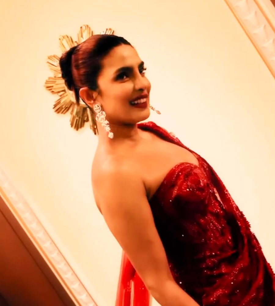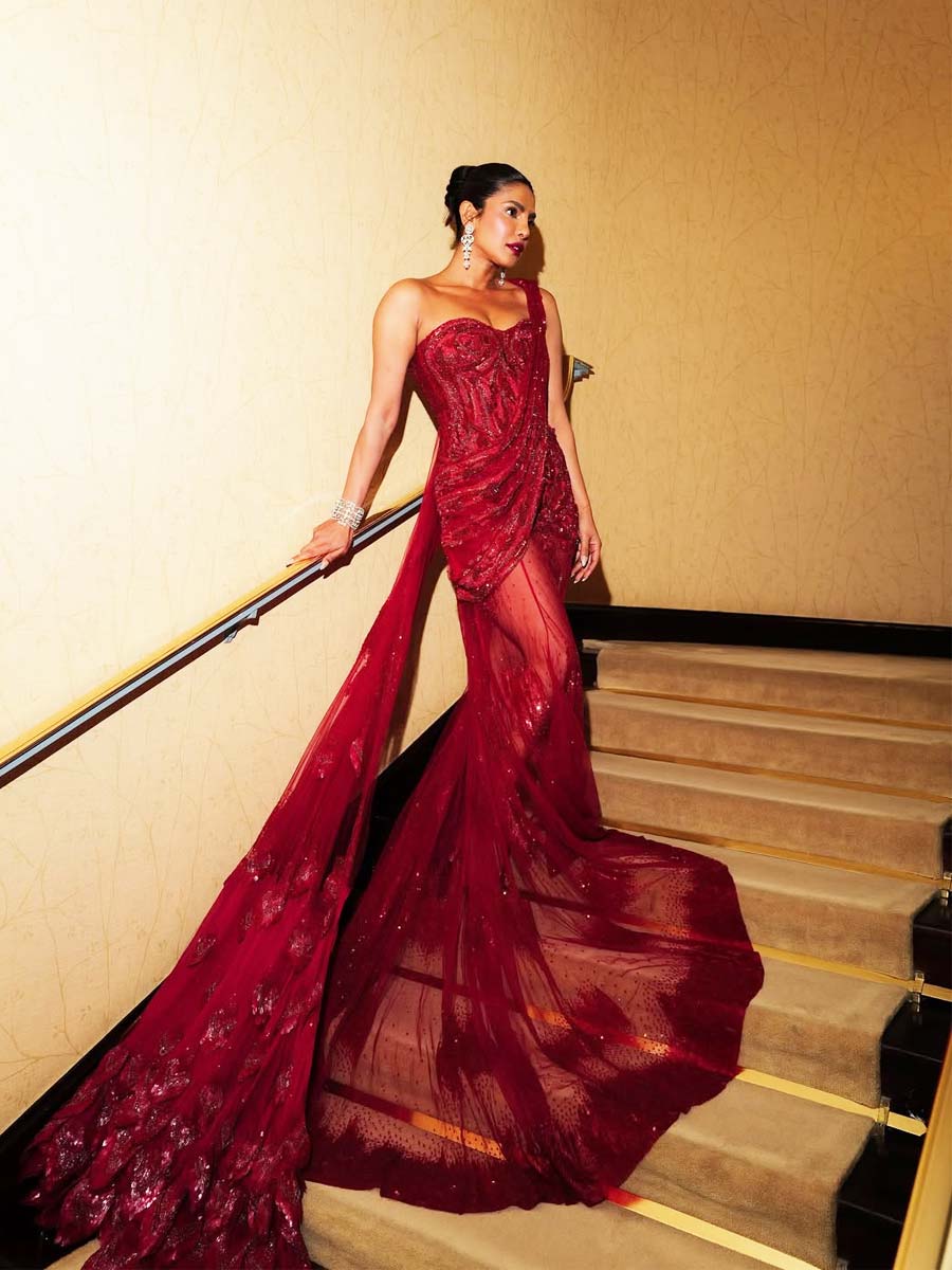 সিঁড়ি, কার্পেট ছাড়িয়ে প্রিয়াঙ্কার পোশাকের 'ভেইল' যেন মায়াবী স্টাইলে মনহরণ করল। দেশি গার্ল বলছেন, এটাই বছরের প্রিয় সময় আমার।