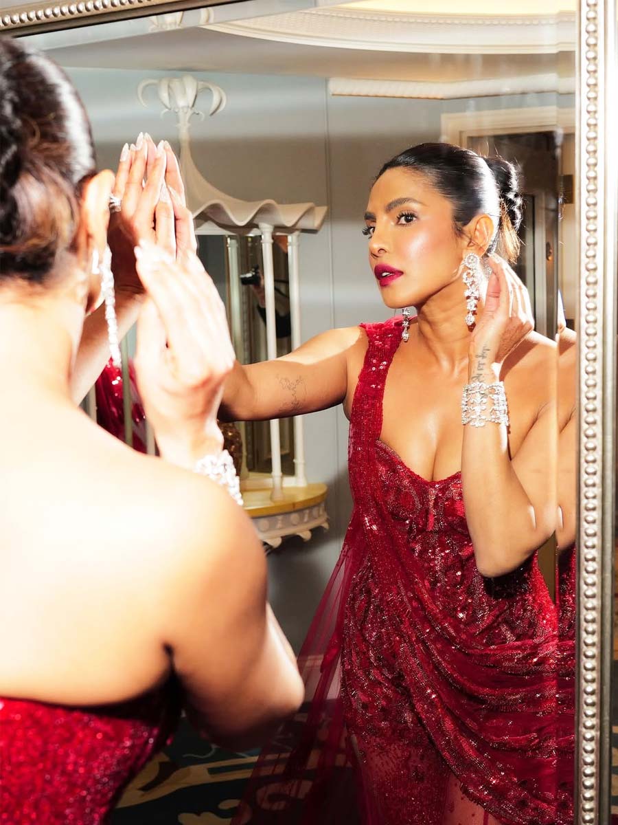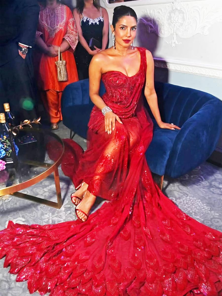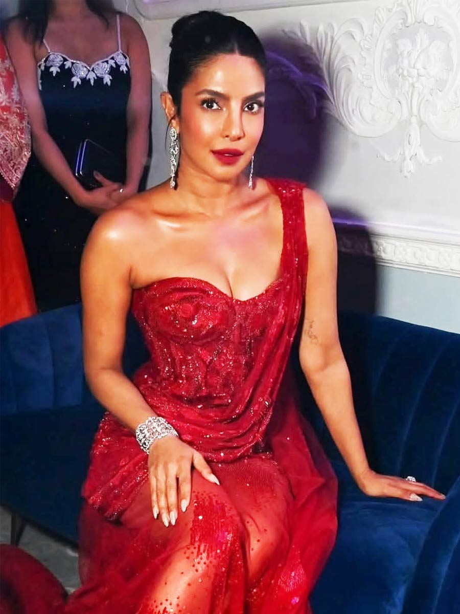 দিওয়ালি পার্টির জন্য এবার আর সোনালি কিংবা রুপোলি রং নয়, বরং প্রিয়াঙ্কা বেছে নিয়েছেন টকটকে লাল নেটের গাউন। ওয়ান শোল্ডার পোশাকে ঝকমারি সিক্যুইনের কাজ।