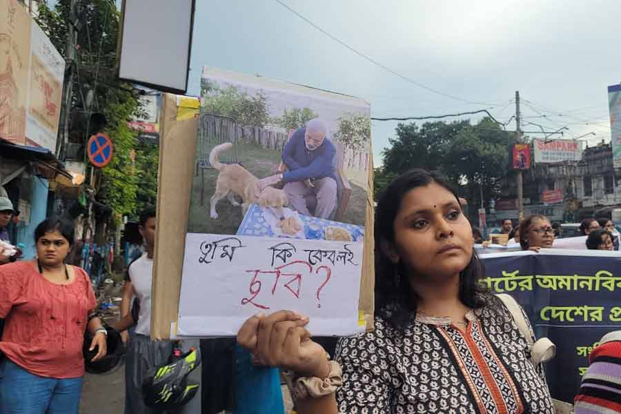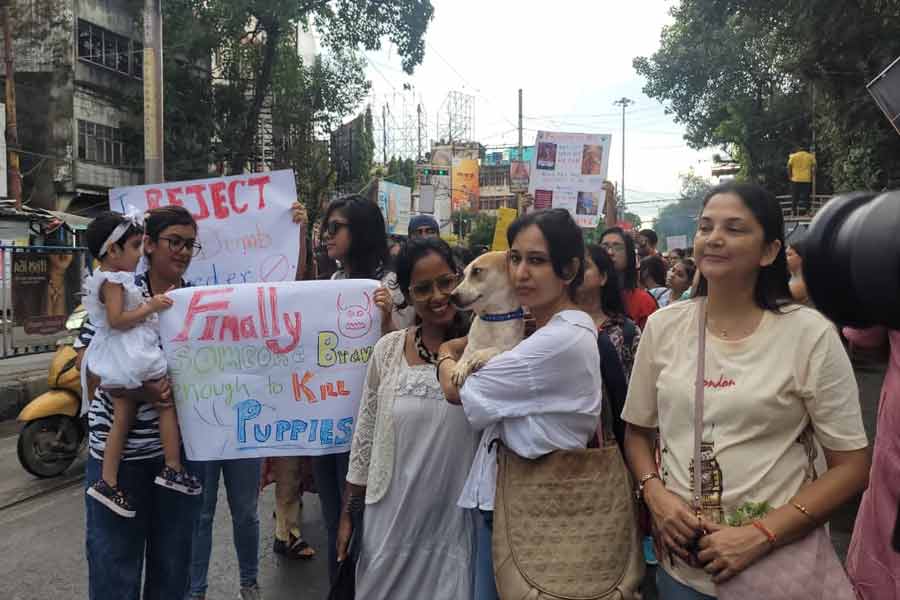 ব্যানার, পোস্টার হাতে মিছিলে শামিল হন পশুপ্রেমীরা। "কুকুররাও সমাজের অংশ, এই রায় বলবৎ হতে পারে না", সরব সারমেয়প্রেমীরা। ছবি: শুভজিৎ মুখোপাধ্যায়।