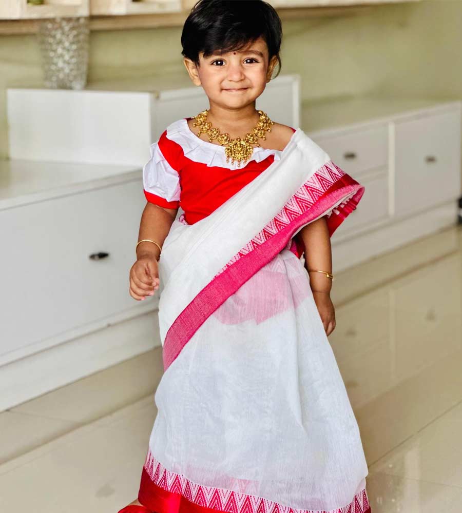 বসন্ত পঞ্চমীতে মহাচমক নিয়ে হাজির রাজ-শুভশ্রী কন্যা ইয়ালিনি। খুদের পরনে লালপেড়ে সাদা শাড়ি। নরম তুলতুলে ছোট্ট দুটি পায়ে পরা আলতা। গলায় সোনালি দক্ষিণী হার। সরস্বতী পুজোয় ইয়ালিনি নিজেই যেন ছোট্ট প্রতিমা!