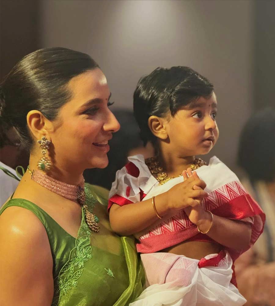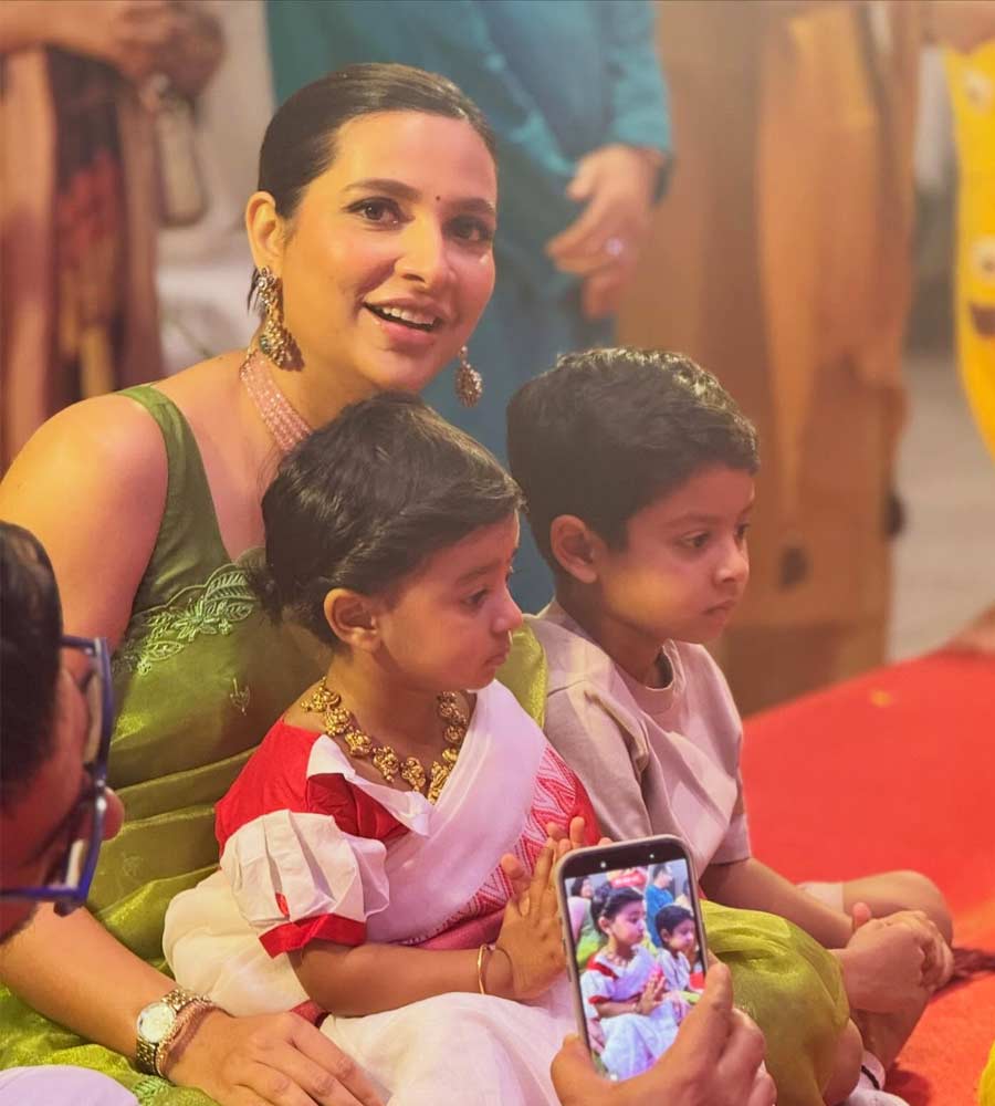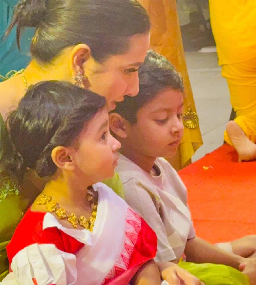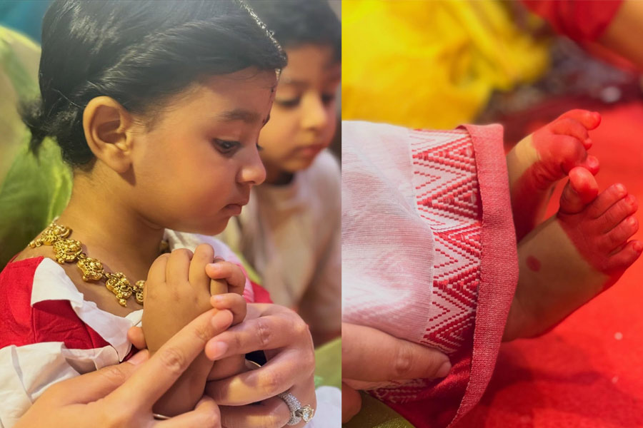 এদিকে বোন যখন মায়ের কোলে বসে হাতেখড়ি দিতে ব্যস্ত, তখন পাশে বসে শান্তভাবে গোটা বিষয়টা পরখ করছিল দাদা ইউভান। বোন শাড়ি-গয়নায় সাজলেও ইউভান অবশ্য স্পোর্টস ওয়্যারেই ধরা দিল।