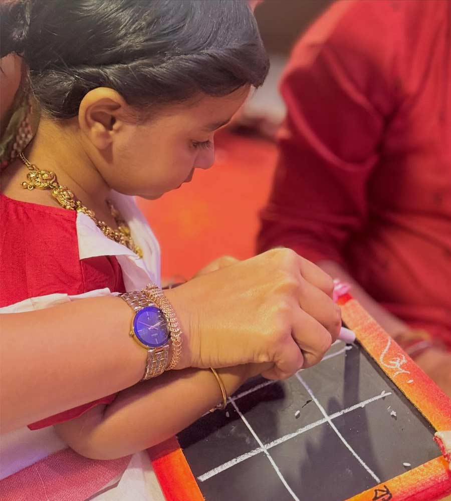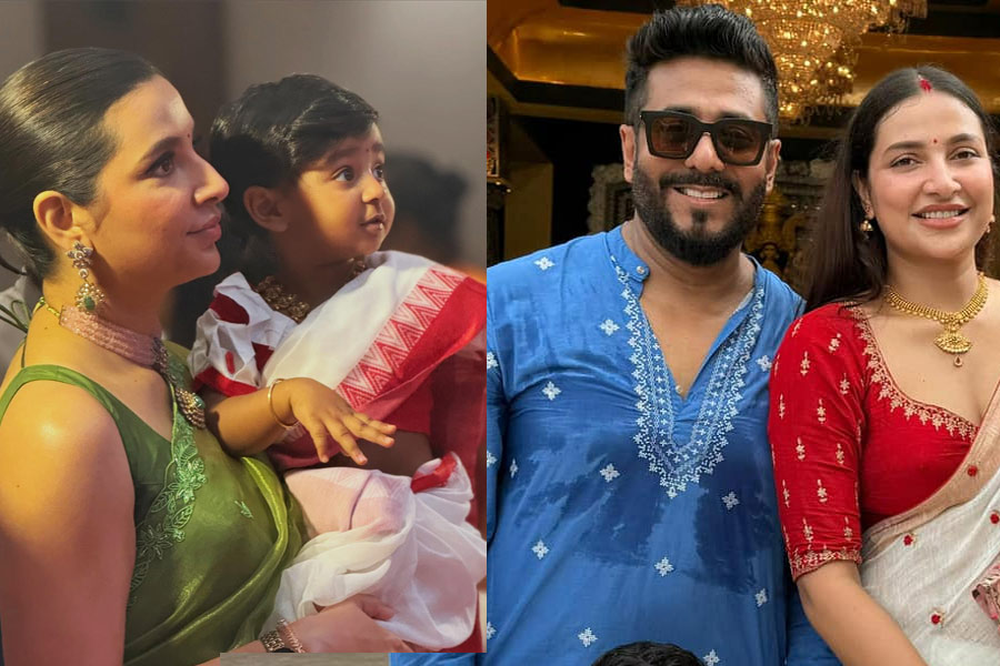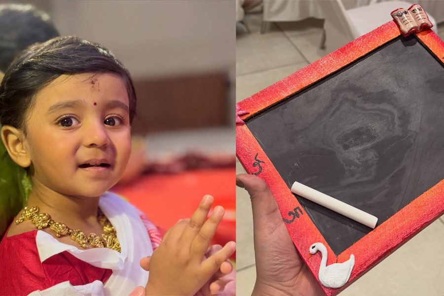 শুক্রবার সাতসকালে শাড়ি-গয়নায় সেজে মা শুভশ্রী গঙ্গোপাধ্যায়ের কোলে চড়ে বিশেষ কাজে বেরিয়েছে ইয়ালিনি। আজ প্রথমবার অক্ষরের সঙ্গে পরিচয় হল তার। সেই জন্যই হাঁস স্টিকার সাঁটা স্লেট-চক নিয়ে অত্যুৎসাহের সঙ্গে সকাল সকাল মণ্ডপে হাজির রাজকন্যা।