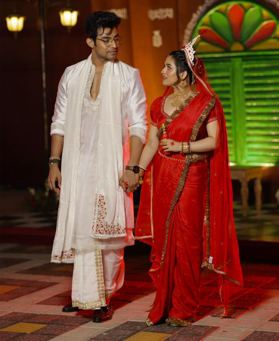 চিরাচরিত বেনারসি কিংবা ধুতি-পাঞ্জাবি নয়, ডিজাইনার পোশাকে বর-কনে বেশে রণজয়-শ্যামৌপ্তি