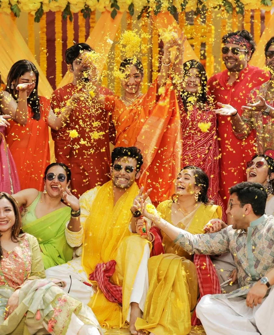 গাঁদাফুলে সাজানো আসর। হলুদ রঙের হ্যান্ডলুম টিস্যু সিল্ক শাড়িতে সেজেছিলেন শ্যামৌপ্তি। হলুদ ব্লাউজে নজরকাড়া মিরর ওয়ার্ক। অন্যদিকে পাঞ্জাবির সঙ্গে হলুদ ওড়নায় রং মিলান্তি ছোঁয়া রাখেন রণজয়।