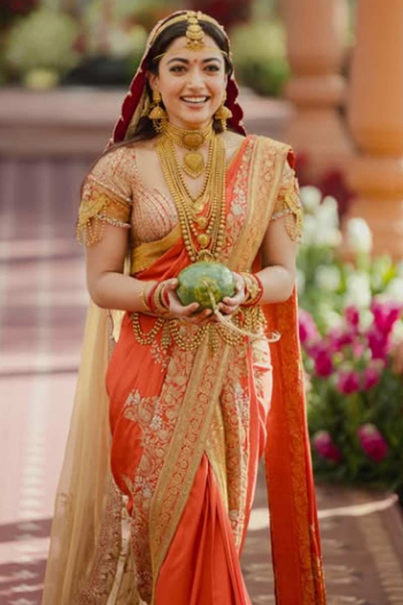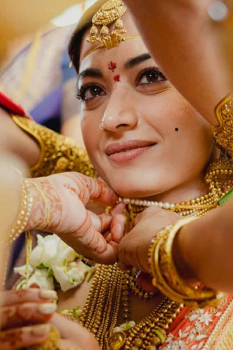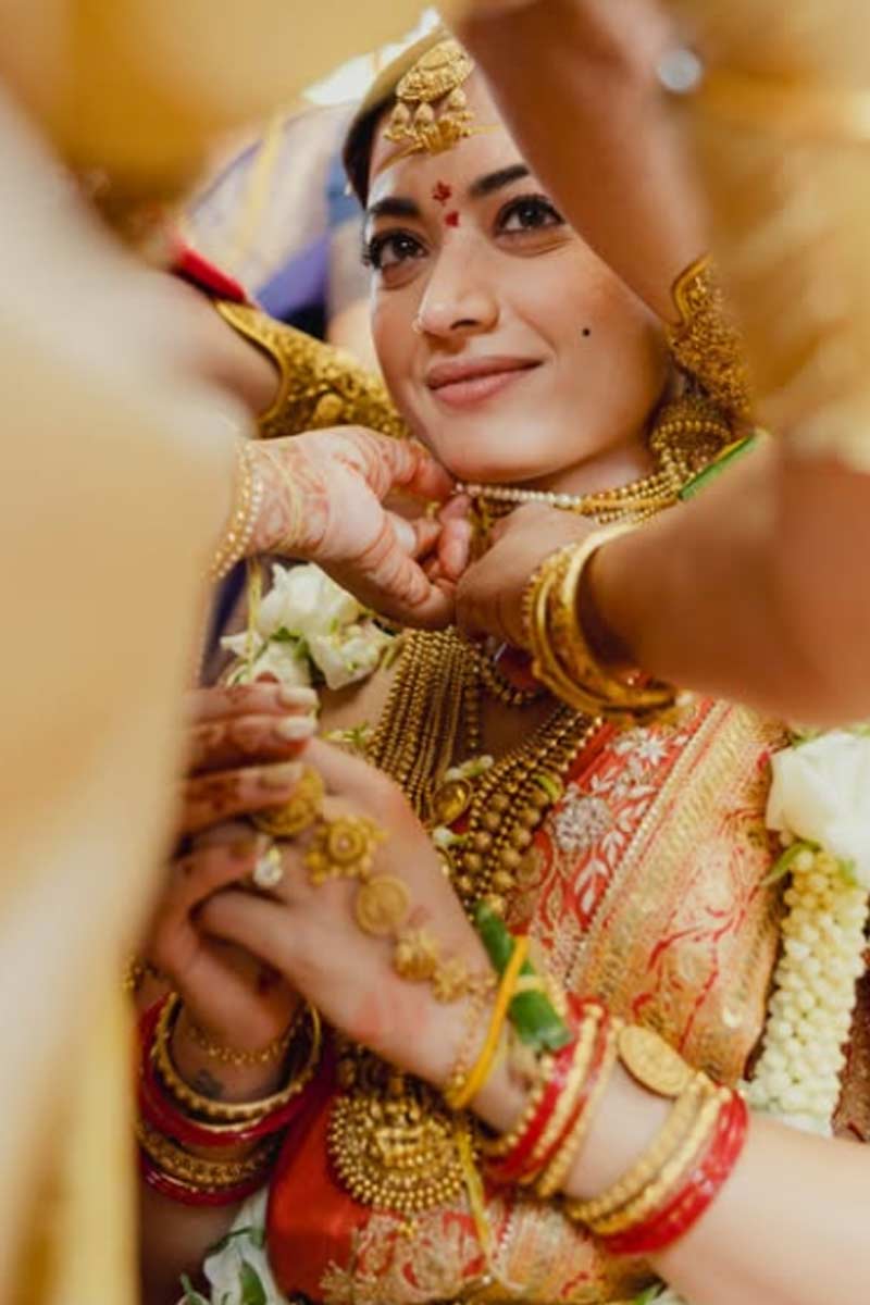 গা ভর্তি গয়না। খোলা চুল। সিঁদুরে লাল রঙের শাড়ি। চওড়া পাড়। ভারী কাজের ব্লাউজ। বিয়েতে যেন স্বর্গের দেবীর মতো সেজেছিলেন রশ্মিকা। ব্যতিক্রমী বিয়ের সাজে চমক দিয়েছিলেন বিজয়ও। অভিনেত্রীর বিয়ের সাজ দেখে মুগ্ধ হননি, এমন মানুষের সংখ্যা নেই বললেই চলে। বেশ কয়েকদিন ধরে তাঁর সাজ নিয়ে আলোচনাও হয়েছে যথেষ্ট।