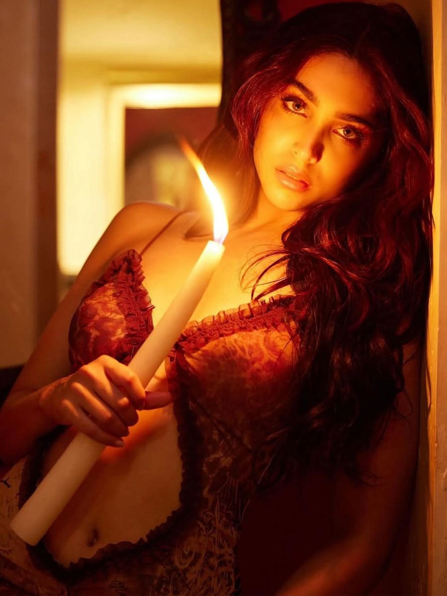 রাতপোশাকে সেজে ক্যামেরার সামনে যেন নিজেকে মেলে ধরলেন শর্বরী। হাতে জ্বলন্ত মোমবাতির শিখা আর শর্বরীর চাহনি মিলেমিশে তৈরি হয়েছে এক অদ্ভূত মাদকতা।