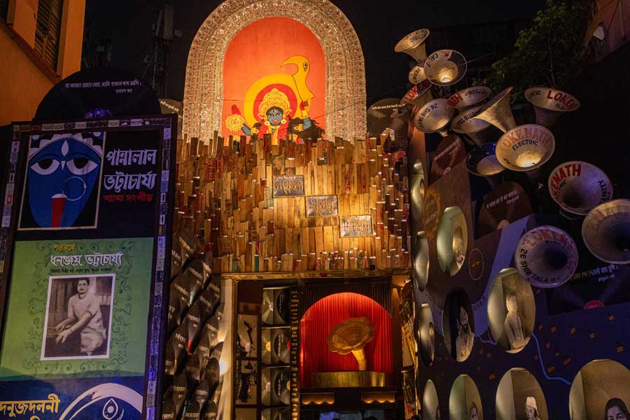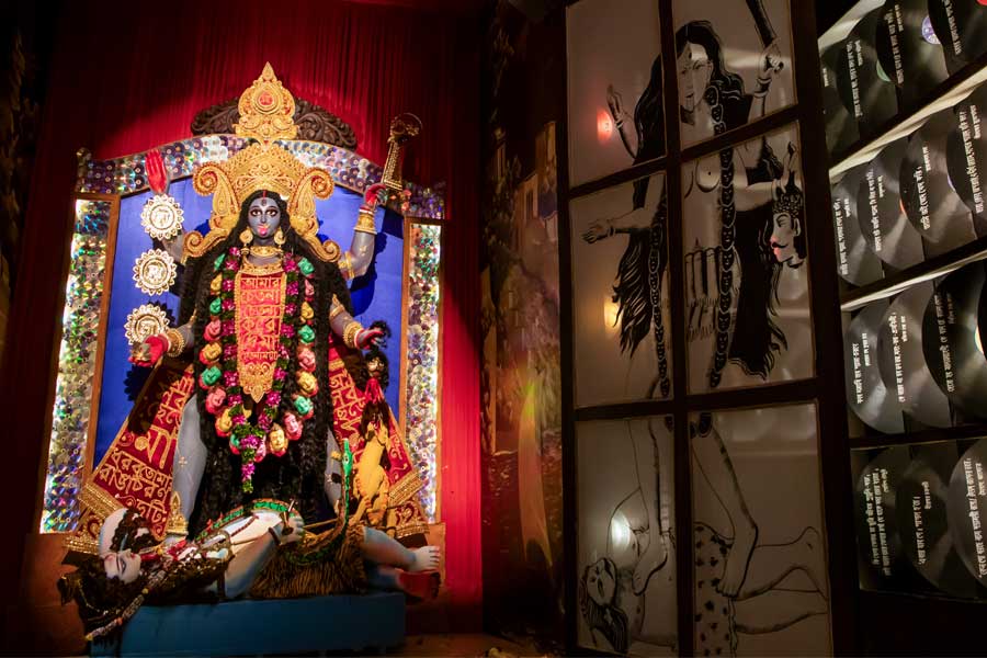 পুজোতে থিমের ছোঁয়া লাগলেও প্রতিমা কিন্তু সাবেকি। শুধু তাই নয়, এখানকার প্রতিমা দীর্ঘদেহী। প্রতিমা সজ্জায় স্বর্ণালঙ্কার ছাড়াও অপূর্বভাবে ব্যবহার করা হয়েছে শ্যামাসঙ্গীত লেখা সামগ্রী। তাতেই আরও আকর্ষণীয় হয়ে উঠেছেন শ্যামা মা।