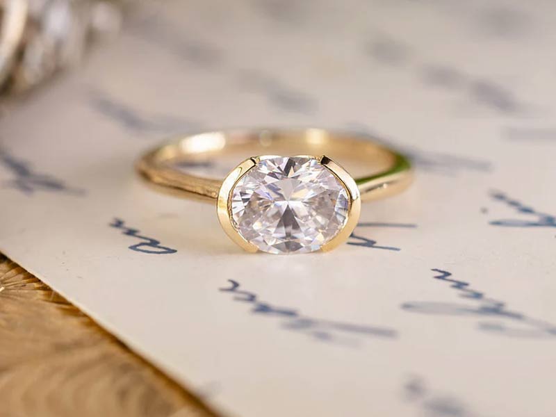 এখন দারুণ ট্রেন্ডিং ইস্ট-ওয়েস্ট সলিটায়ার ডিজাইন। অর্থাৎ সরু সোনা বা প্ল্যাটিনাম রিংয়ের মাঝে গোলাকার হিরে অথবা অন্য কোনও মূল্যবান পাথর, যেমন রুবি, পান্না কিংবা নীলা বসানো। পাত্র-পাত্রী উভয়ের জন্য এই আংটি পাওয়া যায়। একে অপরের সঙ্গে এমন অঙ্গুরী বিনিময়ের পাশাপাশি হোক হৃদয়ের আদানপ্রদান।