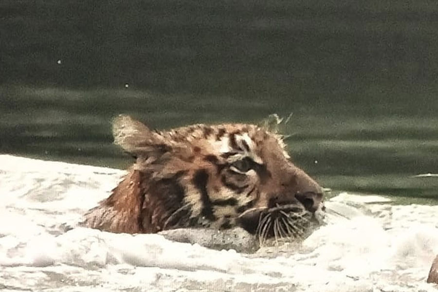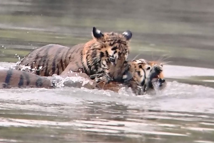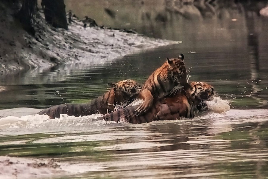 কার্যত এই দৃশ্য বিরল। কারণ, বাঘিনী তার দুই শাবককে সাঁতার শেখাচ্ছে। শাবক দুটি কখনও মায়ের ঘাড়ে উঠছে। আবার জলে ঝাঁপাচ্ছে। মা-ও ধৈর্য ধরে তাদের সাঁতার শেখাতে ব্যস্ত। পর্যটকদের লঞ্চ নদীতেই দাঁড়ায়।