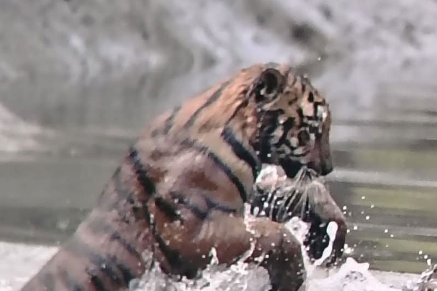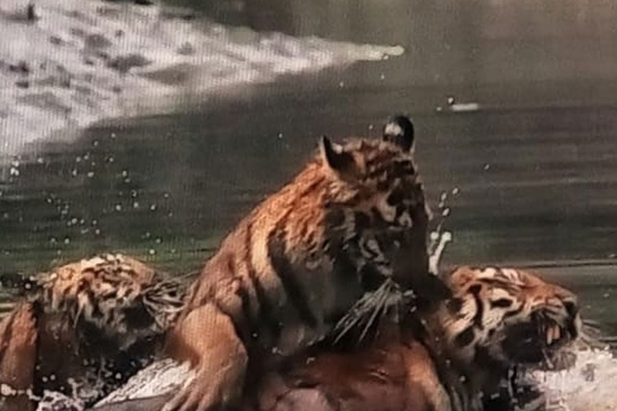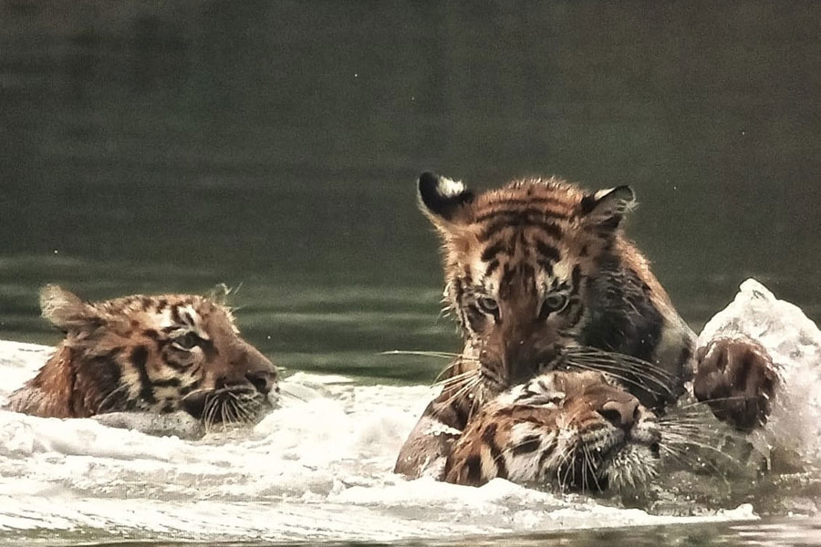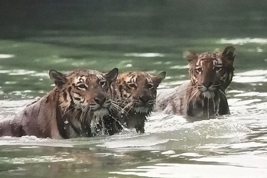 বাঘিনী তার দুই শাবককে সাঁতার শেখাতে ব্যস্ত।