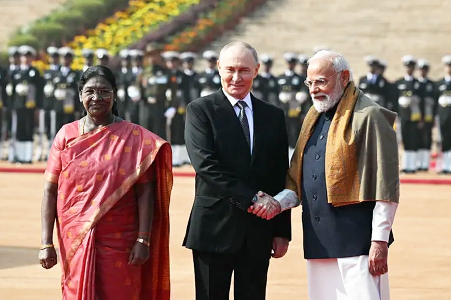শুক্রবার ২৩তম ভারত-রাশিয়া বার্ষিক শীর্ষ সম্মেলনে যোগ দেবেন রুশ প্রেসিডেন্ট। রাজধানীর হায়দরাবাদে হাউসেই অনুষ্ঠিত হবে এই সম্মেলন। ৫ ডিসেম্বর রাষ্ট্রপতি ভবনে পুতিন এবং মোদি, ছবি: এনএনআই।