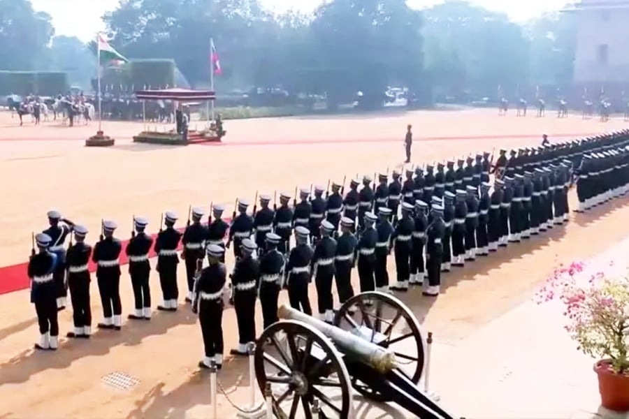 ২১ বার গান স্যালুটের মাধ্যমে অভ্যর্থনা জানানো হয় রুশ প্রেসিডেন্টকে। দেওয়া হয় গার্ড অফ অনারও। উপস্থিত ছিলেন প্রধানমন্ত্রী নরেন্দ্র মোদি এবং রাষ্ট্রপতি দ্রৌপদী মুর্মু। ৫ ডিসেম্বর রাষ্ট্রপতি ভবনে পুতিনকে দেওয়া হচ্ছে গান স্যালুট, ছবি: এনএনআই।