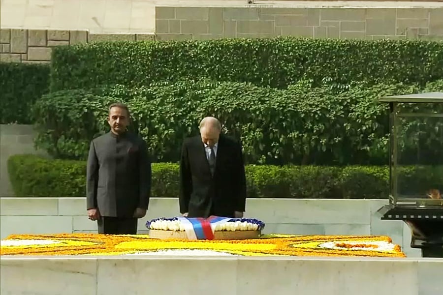 রাষ্ট্রপতি ভবন থেকে বেরিয়ে পুতিন পৌঁছন রাজঘাটে। সেখানে তিনি শ্রদ্ধাজ্ঞাপন করেন জাতির জনক মহাত্মা গান্ধীকে। ৫ ডিসেম্বর রাজঘাটে পুতিন, ছবি: এনএনআই।