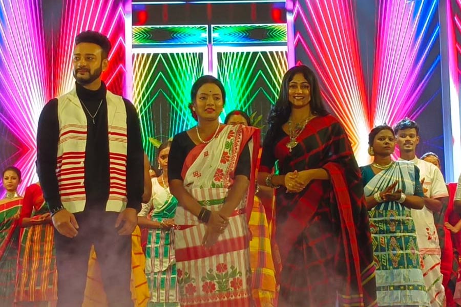 বিষ্ণুপুরের যদুভট্ট হাইস্কুলের মাঠে র্যাম্প ওয়াকেও নজরকাড়া জ্যোৎস্না মান্ডি। আদিবাসীদের ঐতিহ্যশালী 'পাঞ্ছি' শাড়ি পরেই তিনি হলেন শো'জ স্টপার। সাদার উপর লাল চেক এবং লাল-সবুজ ফুলের 'পাঞ্ছি' শাড়ি পরার স্টাইল আলাদা। আর তাতেই আপন ঐতিহ্যের সঙ্গে আধুনিকতার যথাযথ মেলবন্ধন ঘটিয়ে জ্যোৎস্না হয়ে উঠলেন অনন্যা! ছবি: অসিত রজক।