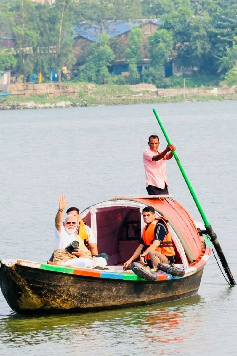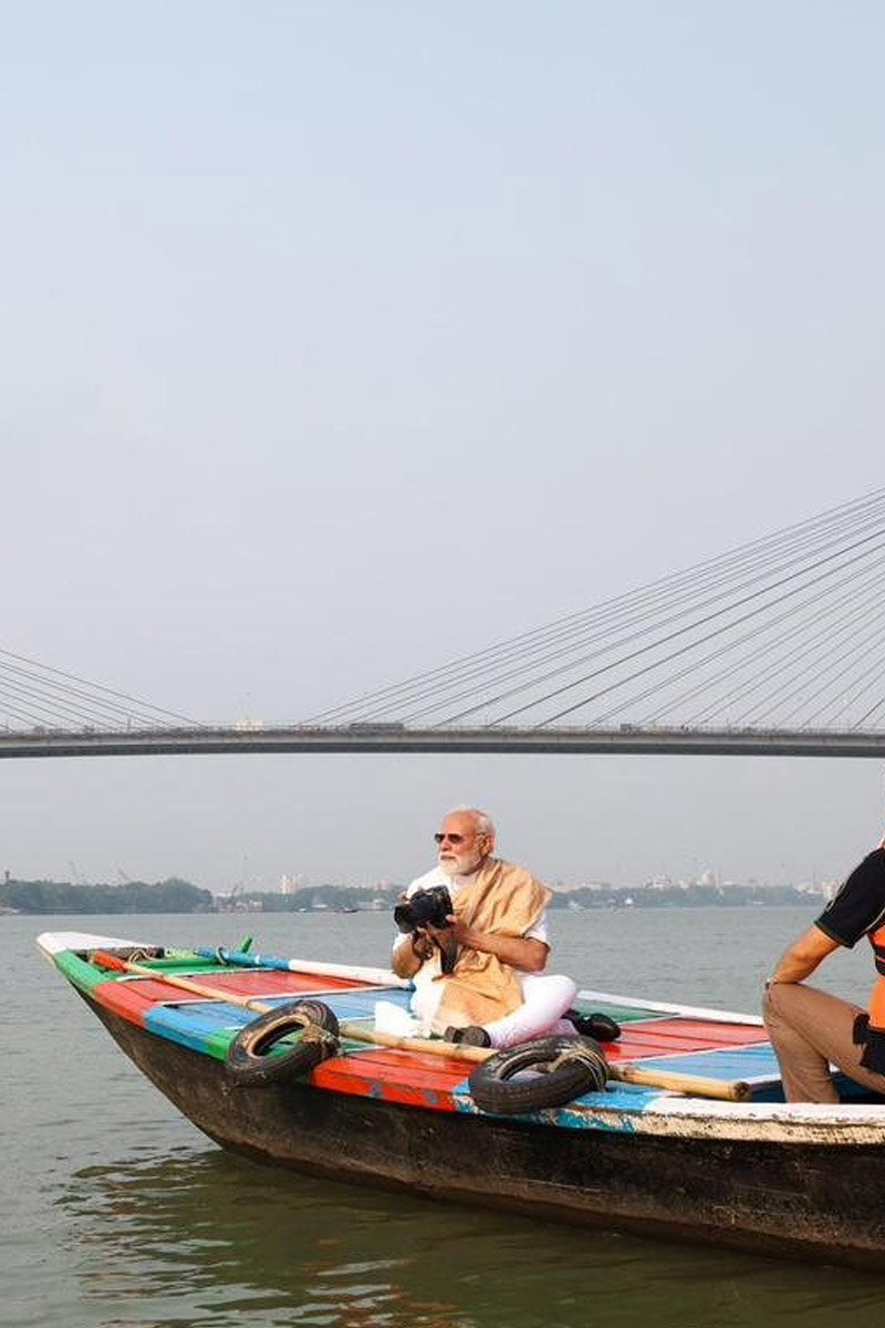 দিন দুয়েক যেতে না যেতেই আবার অন্য 'স্টান্ট'। এবার তিনি গ্রীষ্মের সকালে সাল গায়ে চাপিয়ে গঙ্গার ঘাটে হাওয়া খেতে বেরোলেন। যেমন বাঙালি ভদ্রলোকেরা বেরন। গত শুক্রবার সকালে গঙ্গায় নৌকাবিহারের একাধিক ছবি সমাজমাধ্যমে পোস্ট করেছেন তিনি। ছবিগুলিতে দেখা যাচ্ছে, নৌকায় বসে রয়েছেন প্রধানমন্ত্রী। পিছনে দেখা যাচ্ছে হাওড়া এবং বিদ্যাসাগর সেতু।