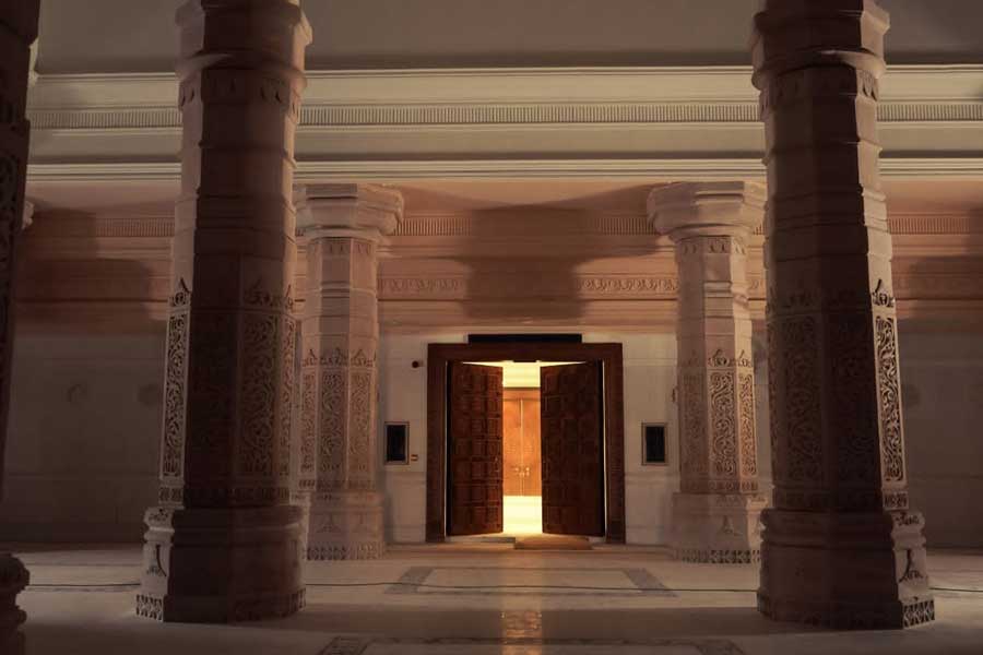 মন্দিরের প্রধান দ্বার দিয়ে ভিতরে প্রবেশ করলেই প্রথমে পড়বে তিনটি দীপস্তম্ভ। পুরীর মতো দিঘার মূল মন্দিরে প্রবেশের জন্য রয়েছে চারটি দ্বার। একইভাবে দিঘার জগন্নাথ মন্দিরের সিংহদ্বার বা মন্দিরের প্রবেশদ্বারের সামনে রয়েছে কালো রঙের অরুণ স্তম্ভ। তথ্য ও ছবি: রঞ্জন মহাপাত্র।